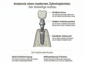 Ein modernes Implantat besteht aus einem dreiteiligen System: einer künstlichen Zahnwurzel, einem stabilen Verbindungsstück und der sichtbaren Krone, die sich in Form und Farbe nicht von Ihren echten Zähnen unterscheidet. Dank neuer digitaler Möglichkeiten hat die zahnärztliche Implantologie einen enormen technologischen Sprung gemacht, von dem Sie als Patient unmittelbar profitieren. Den Kern dieser Entwicklung bildet die intelligente Vernetzung digitaler Daten: Von hochauflösenden Bilddaten über dynamische Aufnahmen in Echtzeit bis zur computergestützten Planung ermöglichen uns neue digitale Hilfsmittel eine Diagnostik und Kommunikation, die weit über herkömmliche Methoden hinausgeht. Dies schafft die Voraussetzung für unsere volldigitalisierten Implantatkonzepte, die Präzision und Komfort vereinen.